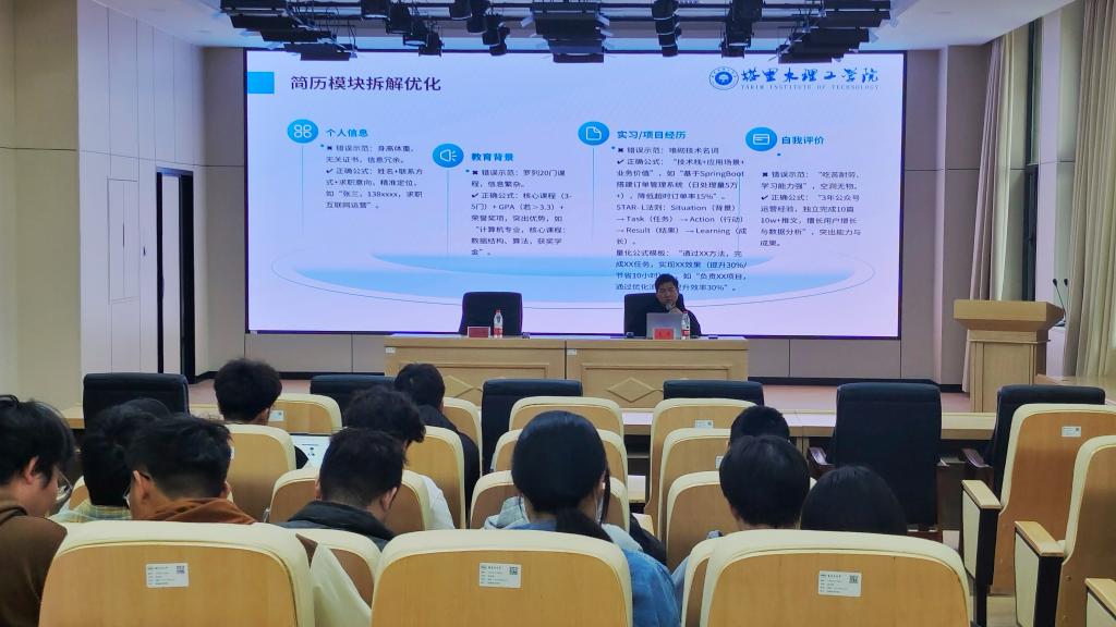承办的“破简而出·全历以赴”简历制作培训会在保密楼B101顺利举行。讲座由学院挂职辅导员王伟主讲,学院2025届全体毕业生参与。