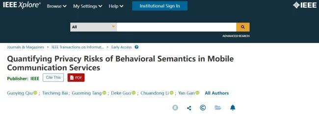 1月25日,久久小说 新引进博士邱国英在《IEEE Transactions on Information Forensics and Security》发表了题为“Quantifying Privacy Risks of Behavioral Semantics in Mobile Communication Services”的学术论文。该期刊为中国计算机学会推荐的网络与信息安全领域国际顶级期刊,CCF-A类Trans;同时为中科院SCI一区Top期刊,影响因子6.3。邱国英博士为论文第一作者,白铁成教授为通讯作者。